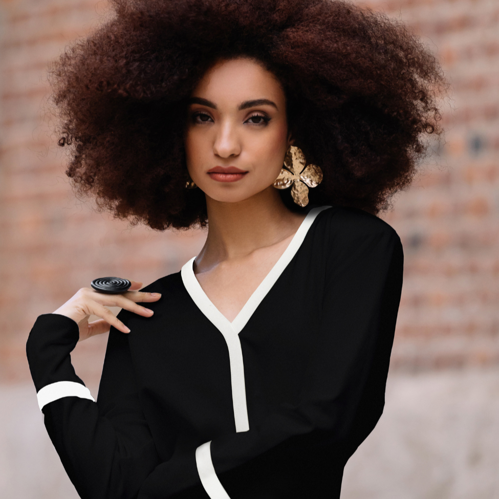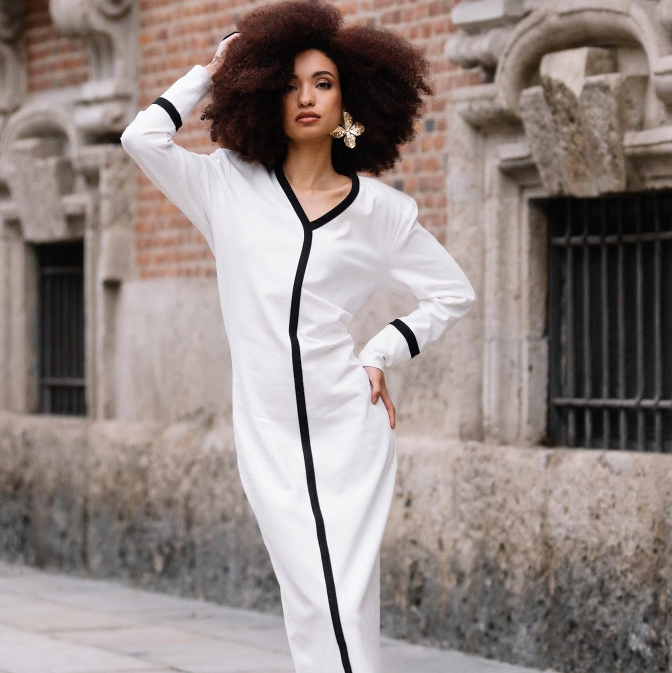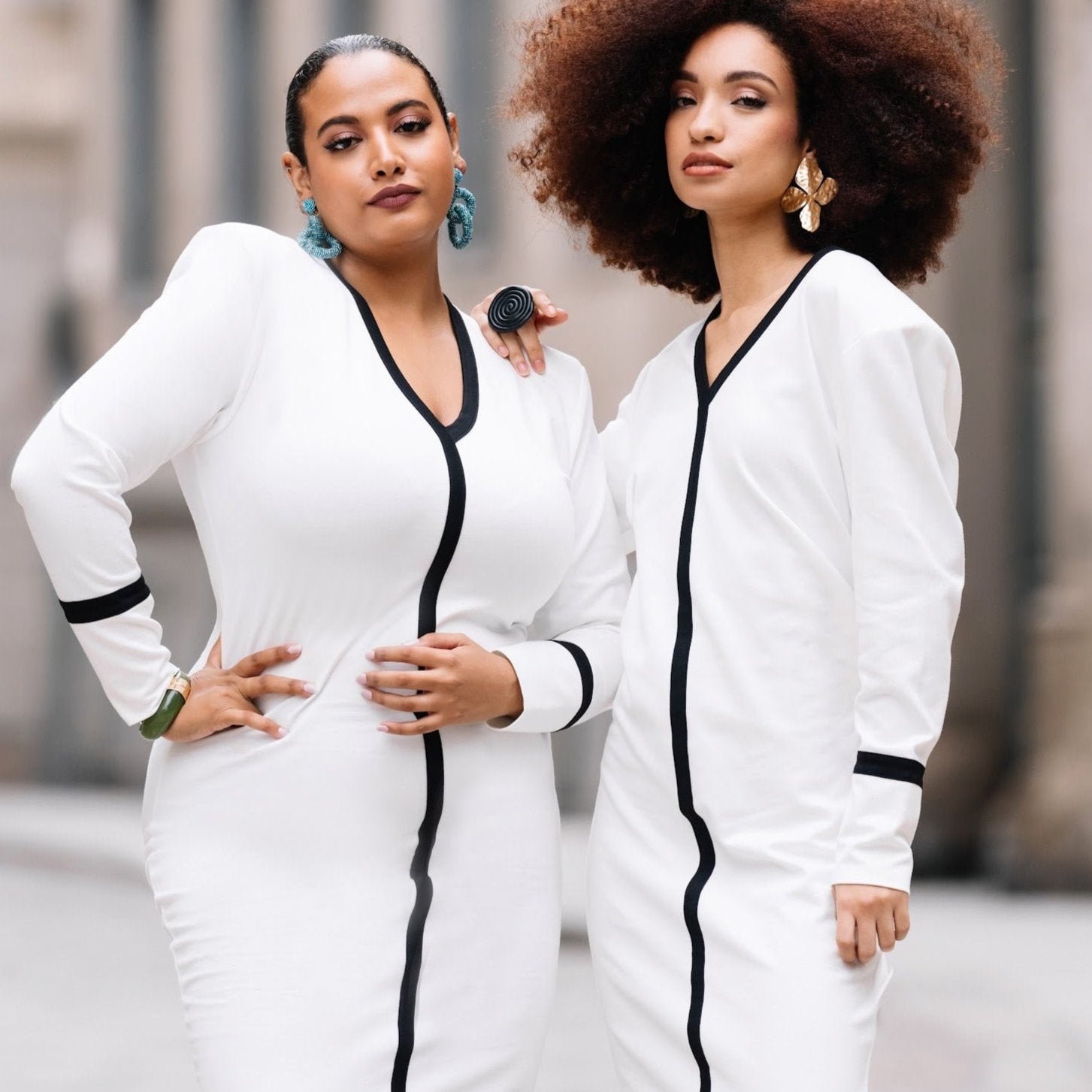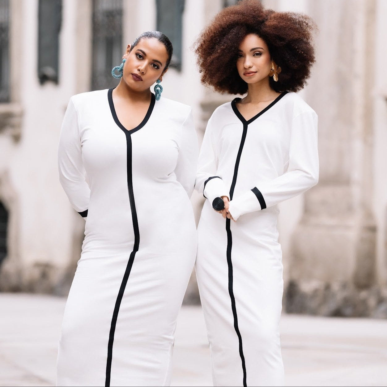 The Windsor Midi Dress is refined, elegant, and sophisticated. Its contrasting vertical lines provide an elongating silhoutte and its structural integrity and stretch provides support in all the right places. Midi length dress with a V neck, structured shoulders, and long sleeves. Available in Black and White. Perfect for work or evening wear.