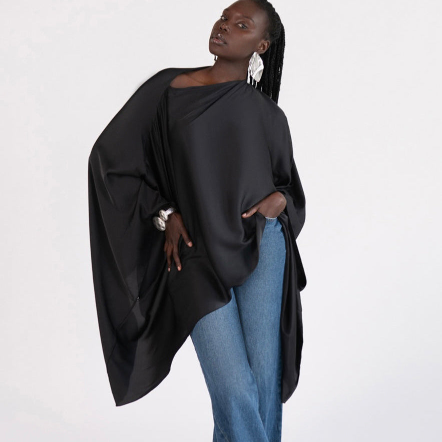 What is black, fluid, and goes with everything? The Zaya top! Wear it loose, tucked, or belted with jeans, skirts, or pants…..she really is a hard worker.